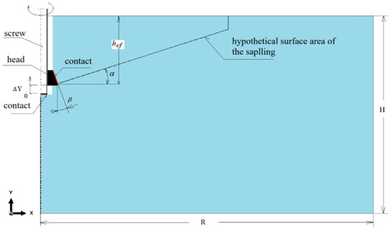 An axisymmetric, two-dimensional (2D) model was adopted to represent the interaction between the anchor and the rock mass, as illustrated in Figure 8. Based on previous experimental observations [50], the extent of the failure zone at the rock’s free surface was assumed to reach approximately 3hef, where hef denotes the effective embedment depth of the anchor.