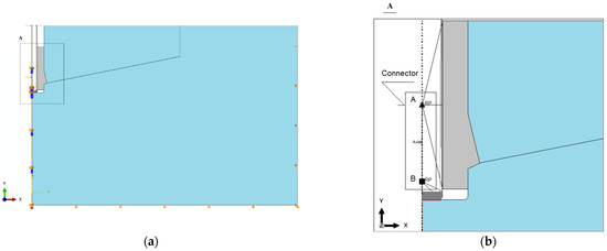 This type of connector element includes two nodes (A and B, see Figure 10) whose relative distance can be prescribed and controlled during the simulation. This configuration allows for relative displacement between the two selected nodes of the model exclusively along a predefined axis—in this case, the Y-axis (as shown in Figure 10b)—while rotational degrees of freedom are restricted.