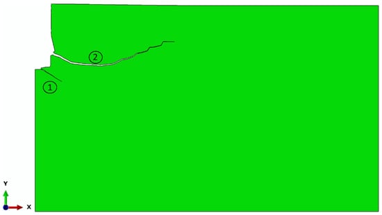 This estimated failure geometry was explicitly considered in the model to ensure increased finite element mesh refinement in the region of expected crack propagation. By concentrating the mesh in this critical zone, the accuracy of stress distribution analysis and fracture simulation was significantly improved, allowing for detailed observation of damage evolution under the applied load.