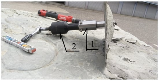 Considering the limitations of the rock detachment method based on pulling out an anchor installed in accordance with standard anchoring procedures used for concrete, an alternative detachment process was carried out using a modified HDP-A type anchor. The modification involved detaching rock fragments by expanding the elements of the anchor near the bottom of the borehole, achieved by enabling the anchor’s drive screw to thread into a conical head (e.g., [50]). During the detachment process, the torque applied to the drive screw was recorded. Based on the calibration of the measurement system, it was possible to determine the equivalent detachment force—analogous to the pull-out force used in conventional anchor-based detachment technology. The essence of this method is illustrated in Figure 4.