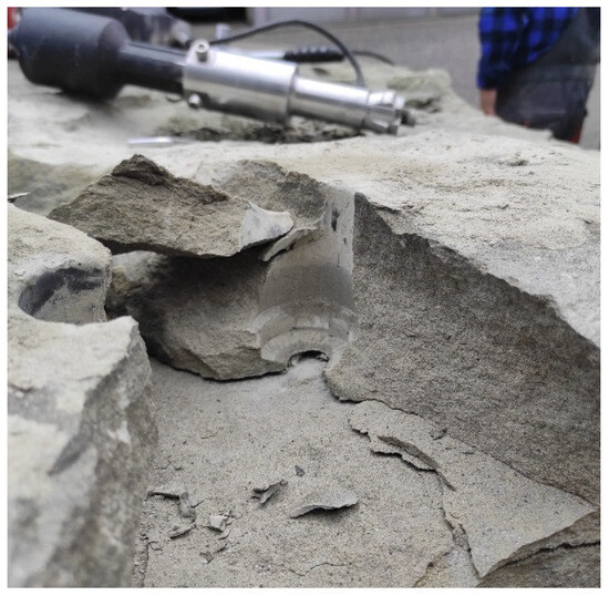 In the case of gray sandstone, this is a good approximation, since in the course of field studies [50] there was an unambiguously defined zone of destruction characteristic of brittle materials, with an unambiguously defined course of fracture accompanying the detachment of lumps of rock in the form of a pseudo-cone of destruction (through the classic tearing of the material), which was widely described by the authors [61]. In other media, the image of destruction changed [56,66], but the fracture mechanism itself did not differ from that observed in gray sandstone (ignoring the influence of disturbances in the structure of the material or its cracks).