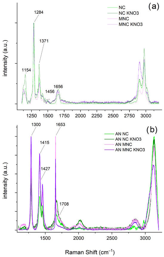 Raman spectra of (a) cellulose nitrate samples and (b) cellulose nitrate samples supplemented with AN.