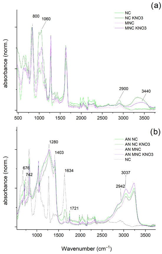 IR-ATR spectra of (a) cellulose nitrate samples and (b) cellulose nitrate samples supplemented with AN.