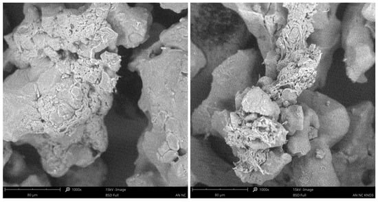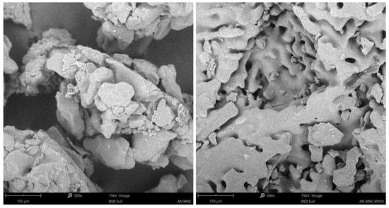 SEM analysis revealed that, regardless of the type of nitrocellulose used, adhesion of AN to the surface was observed in all samples. In the case of the NC-KNO3 sample, residues of sulphate salts originating from the synthesis process were detected (Figure 3). For MNC (Figure 4), a higher degree of surface coverage was observed compared to the NC sample. However, no formation of a core–shell structure was detected in any of the analysed samples, as clearly confirmed by the obtained images.