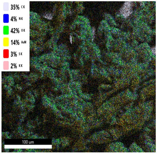 SEM-EDS measurements revealed the presence of sulphur, uniformly dispersed over the entire surface of the samples prepared using KNO3. In all samples, the sulphur concentration is similar, at the level of 3 wt. % (Figure 5 and Figure A1). It should be noted that cellulose nitrates cannot be differentiated from AN using SEM-EDS, as both contain the same types of distinguishable atoms (carbon atoms are present in the adhesive film attaching the sample to the holder and, as such, are not investigated). In Figure 5, EDS results are presented for the transition of an electron from the L to the K level in an atom (Kα line); in the designation, e.g., “C K”, the letter K denotes this line.