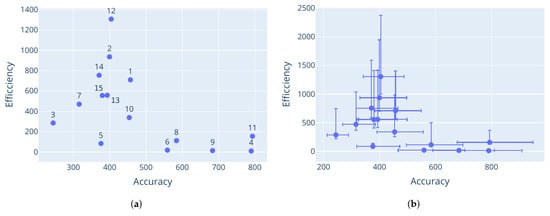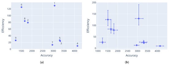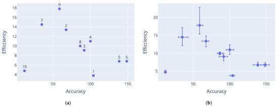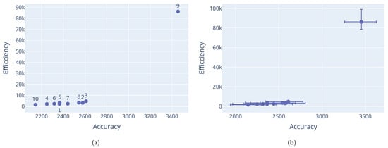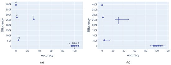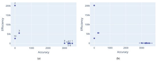 Each function was tested in dimensions. The search space was a hypercube, centred on the origin, with lower and upper bounds defined in Table 6. A significance level of was used for the Friedman test. An initial sample of 2048 parameter configurations were considered. Tuning was performed based on two performance objectives, namely accuracy and efficiency (see Section 3.2 for definitions), and a threshold value of was used.