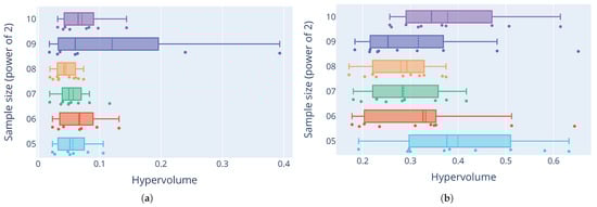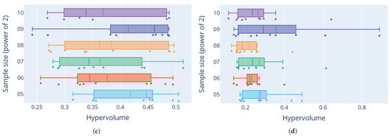 The results of the sensitivity analysis generally show varying levels of the quality of the generated Pareto-optimal fronts. For the Ackley function, Figure 9a shows consistently low hypervolumes for most sample sizes, apart from a sample size of , which shows unusually high outliers. For the Rastrigin function in Figure 9b, the distribution of hypervolumes is more varied when comparing different sample sizes. The distributions tend to be skewed towards smaller hypervolume measures. Still, large variance of the hypervolumes indicates high sensitivity to the initial distribution of the starting sample. The Rana function in Figure 9c has a much larger variance in the quality of the fronts. The stark difference between distributions for this function and the others show how the quality of the tuned configurations differs not only between different sizes of the initial sample, but the underlying optimisation problem itself. Some problems prove to be much more difficult to tune consistently. Figure 9d shows that parameter configurations for the Schwefel function had similar quality distributions as those for the Ackley function. Hypervolumes are on average relatively small, with some outliers, especially with a sample size of . As these results show, M-race is very sensitive to the quality and size of the initial sample of parameters.