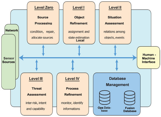 Figure 1), which is still a standard reference in the industry today. The model was assigned several primary objectives: (i) to provide a common framework for discussion on information fusion; (ii) to enable the recognition of problems that can be solved by applying fusion techniques; (iii) to standardise the characteristics of fusion-type problems; (iv) to provide a framework that can be used to guide the design of computational solutions; (v) to enable the classification of various fusion processes.