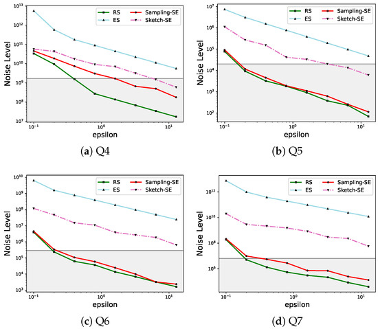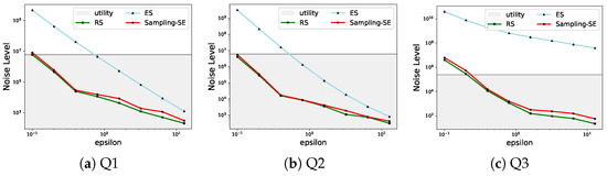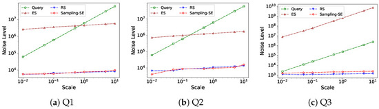 Impact of Data scale. In this part, we evaluated the effects of data scale on the noise level. We used the TPC-H datasets with scale factors ranging from 0.01 to 10 and tested the performance of different methods with Q1, Q2, and Q3. We can see from Figure 13 that Sampling-SE maintains stable noise levels as data scales, confirming its suitability for large datasets. Note that for Q1 and Q2, Sampling-SE preserves the maximum boundaries of RS, yielding identical noise levels. To validate utility preservation, we compared noise magnitudes with the original query results. Crucially, Sampling-SE maintains noise levels strictly below the actual query answers, guaranteeing the original data insights remain clearly visible, which enables practical deployment in real-world applications where data utility is mission-critical.