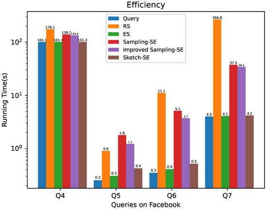 We also compared the efficiency of different methods on the Facebook dataset, and the results are plotted in Figure 9. We set the parameters and and the sample rate at . The results demonstrate that Sampling-SE performs effectively in most scenarios. While slightly less efficient than RS for Q5, which involves only three small relations and, consequently, has minimal RS computation time, Sampling-SE shows superior scalability with larger datasets and complex join conditions, where its utility advantages become particularly significant. Notably, ES and Sketch-SE benefit from the offline pre-computation of statistics and sketches, respectively, giving them inherent online efficiency advantages over methods requiring real-time computation. This makes Sampling-SE ideal for real-world applications like fraud detection and customer profiling, which require both scalable join processing and rigorous privacy guarantees.