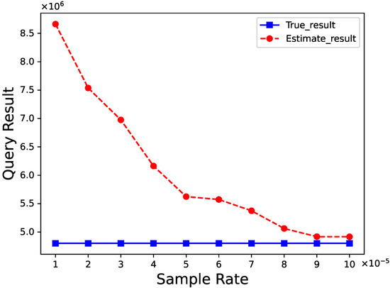 To further evaluate the efficacy of our sampling method, we examined a cyclic residual query, representing a key target scenario for Sampling-SE: “select max(count) from (select edge2_from, count(*) from group by edge2_from) as t;”. Figure 11 shows that even at low sampling rates, varying from to , the method achieves highly accurate estimations. This confirms the effectiveness of Sampling-SE for complex cyclic queries while maintaining computational efficiency.
