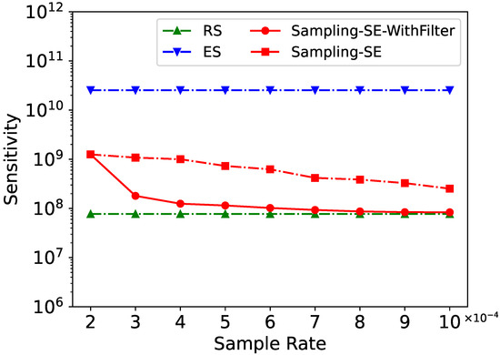 Additionally, we tested the effect of sampling rate on sensitivity as a way to eliminate the interference of the differential privacy noise added to the data. The experimental result is shown in Figure 12. To enhance efficiency for high-cardinality join results, we introduced Sampling-SE-WithFilter, a strategy that estimates only the maximum group size via random sampling rather than computing all group sizes. As illustrated, this approach achieves significantly faster convergence than basic Sampling-SE with increasing sampling rates.