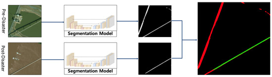 The primary dataset used in this study is xBD, consisting of a total of 9330 high-resolution satellite image pairs (i.e., pre- and post-disaster). Individual images were resized to 1024 × 1024 resolution. The dataset is split into training, validation, and test sets at a 7.0:1.5:1.5 ratio, that is, 5598 images, 1866 images, and 1866 images, respectively. In addition, pre-processing includes three steps such as radiometric normalization to standardize brightness levels, histogram matching to improve temporal consistency between image pairs. To prepare the images for the model input, each original 1024 × 1024 image was divided into four non-overlapping 512 × 512 patches via cropping. To address the challenge of non-disaster-related changes (e.g., road repaving) occurring between image acquisition dates, a specific labeling methodology was adopted. For each post-disaster image, the corresponding ground-truth mask was created by starting with the pre-disaster road mask as a template. Annotators then specifically marked only the sections that showed clear evidence of disaster-induced damage. Consequently, a repaved but structurally intact road would appear different in the imagery but remain labeled as ‘undamaged’ in the ground truth of this study. This process implicitly teaches the model to associate only labeled structural changes with the ‘damaged’ class while learning to tolerate mere appearance variations. While this strategy mitigates the issue, it is acknowledged that extreme non-disaster changes could still present a challenge, which remains a topic for future investigation.