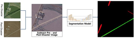 Let the pre- and post-disaster images be . The process is as follows: