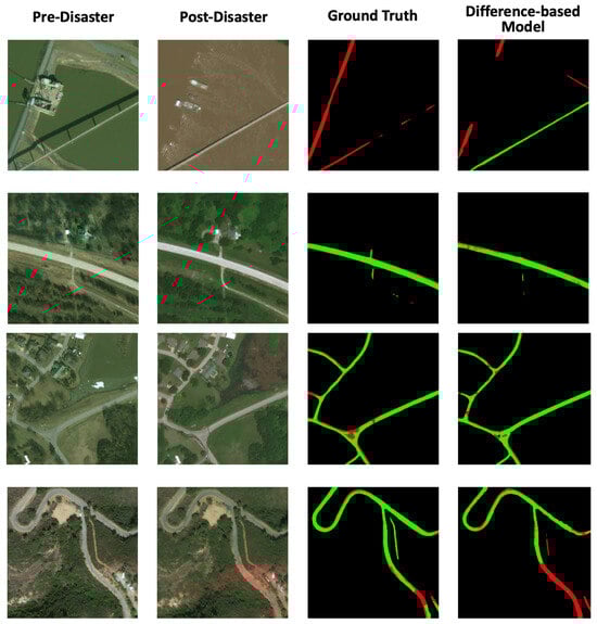The superior performance of the difference-based model can be attributed to the inherent compatibility between road features and change detection techniques. Roads are continuous, linear structures, and disruptions such as fractures or disconnections appear distinctly in difference images. This structural clarity enhances the effectiveness of change-enhanced segmentation.