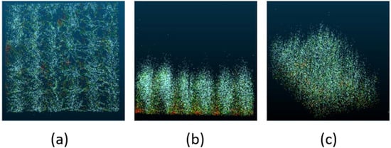 The dataset used in this study was the publicly available SGCBP (Small Grain Cereals Biomass Prediction) dataset [], with data sourced from field experiments conducted in 2019 at Yanco, New South Wales, Australia. The experiment involved sowing 26 varieties of small grain cereals (wheat and barley) at two different densities—250 seeds per square meter and 50 seeds per square meter—resulting in a total of 156 plots. Each plot was scanned at two distinct growth stages: the early stage (August, vegetative phase) and the late growth stage (October, flowering phase). A LiDAR system was employed at a height of 2 m to generate point cloud data during the scans. Following the LiDAR scanning, ground samples were collected from each plot. In the early stage, samples were collected from a 1-square-meter area, while in the flowering stage, samples were collected from a 0.5-square-meter area. The samples were dried at 70 °C for 7 days until a constant weight was achieved, after which the above-ground biomass (AGB) per unit area (g/m2) was calculated. The dataset comprised 306 point clouds along with their corresponding manually measured ground-truth AGB data. The dataset was split into 204 training plots and 102 testing plots. A visualization of the SGCBP point cloud data is presented in Figure 1, displaying, from left to right, the top view, side view, and oblique view, respectively.