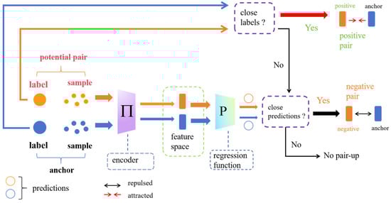 The two augmented samples,  and , are passed through the feature encoder  to generate two feature vectors  and . These are then processed by the regression function  to obtain  and . For the selection of positive and negative sample pairs, a similarity function is used to calculate whether the similarity between the two label values or predicted values exceeds a threshold.