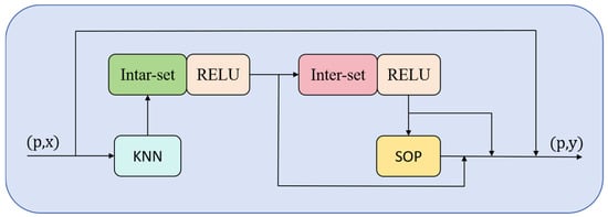 Structure of the PFMixer module. Input point coordinates (p) and features (x) undergo kNN neighbor selection, followed by ‘intra-set’ mixing for local feature interaction and ‘inter-set’ mixing for feature propagation across regions, both with ReLU. Symmetric Operation Pooling (SOP) aggregates features to output updated features (y), enhancing biomass-related feature representation.