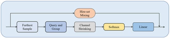The overall structure of the PTransDown (Point Transition Down Block) module is shown in Figure 4. It includes hierarchical set mixing, farthest point sampling, neighborhood query and grouping, channel contraction, Softmax normalization, and linear layers. Through farthest point sampling, the module selects representative points from the original point cloud to preserve key information. Next, feature information undergoes hierarchical set mixing and neighborhood query and grouping, enabling feature interaction and local feature acquisition. The channel contraction module reduces the dimensionality of neighborhood features, decreasing computational complexity. Softmax normalization determines feature weights, providing a reference for feature integration. The linear transformation module maps the input features to the output space and extracts feature information. Finally, the linear layer outputs the feature, which is fused with the hierarchical set mixing output features, offering decision support for the biomass prediction task. These steps work collaboratively, allowing the PTransDown module to effectively reduce the dimensionality of point cloud data, extract key features, and provide a foundation for biomass prediction tasks.