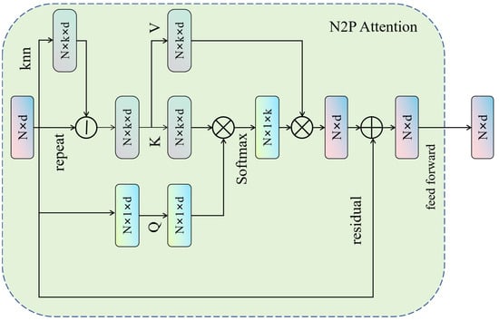 N2P Attention is a key attention mechanism specifically designed for point cloud data processing []. Its structure includes three main components: query (Q), key (K), and value (V), and it works by calculating the correlation between a point and its neighbors to capture local information. Since point cloud data typically has complex structures and high-dimensional features, traditional methods struggle to effectively capture local information and relationships. N2P Attention, on the other hand, can capture the information from the neighbors surrounding each point, allowing for a better understanding of the local structures and features within point cloud data. This results in improved accuracy and performance in biomass prediction tasks. By introducing N2P Attention, the network can more fully leverage the relationships between the points in the cloud, enabling the model to make more accurate predictions of biomass while maintaining efficiency and flexibility when processing large-scale and complex point cloud data. The structure of N2P Attention is illustrated in Figure 5.