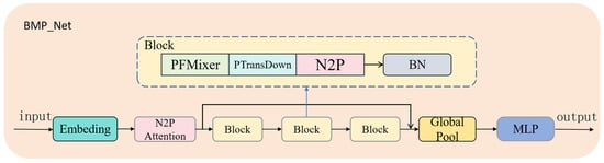 The network benefits from the PointMixer [] framework structure, utilizing multiple cross-layer residual connections to facilitate information exchange. This design effectively explores the relationship between point cloud structure, point cloud density, and the corresponding biomass. The architecture of BMP_Net is shown in Figure 6. Initially, the point cloud data is converted into low-dimensional vectors through an Embedding layer, enabling the neural network to learn and process the data effectively. The N2P Attention module then processes the Embedding output and point information, capturing crucial details about the neighbors of each point, thus enhancing the point cloud data processing performance. The data is further processed by the PFMixer module, point cloud transition downsampling module, and N2P Attention, followed by a BatchNorm normalization layer. These modules are combined in three consecutive stages, deepening the extraction of point cloud features while compressing the feature data, which facilitates efficient point cloud network computation.