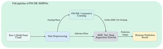 Summary of the full PSCDR-BMPNet pipeline for biomass prediction. Raw LiDAR point clouds are preprocessed before entering the model. During the training phase, the PSCDR module provides a contrastive learning objective to guide the optimization of the BMP_Net deep regression network. For inference, the trained BMP_Net directly processes input data to generate the final biomass prediction.