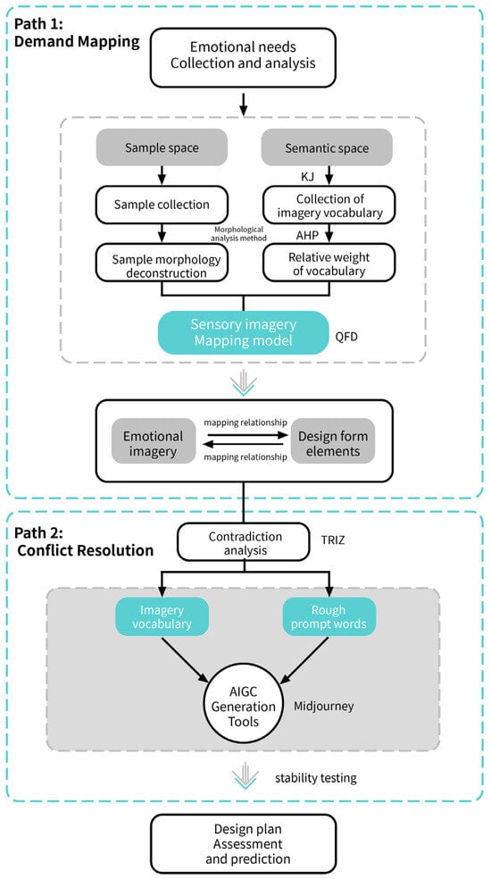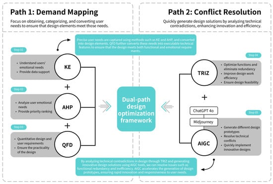 The effective combination of these methods forms the core of the Dual-Path Optimization Framework, where AHP, QFD, TRIZ and KE work together to optimize the design in both the functional and emotional dimensions. AIGC, as a supporting tool, helps designers to quickly generate design solutions while ensuring the synergies between the methods are efficiently realized. AIGC not only accelerates the design process but also helps to effectively integrate the complex emotional and technical contradictions to ensure that the final design solution meets the user’s emotional needs, as well as the technical feasibility requirements. Through this interdisciplinary integration, this study realizes the precise transformation of design goals and promotes the practice and development of innovative design, as shown in Figure 1 and Figure 2.