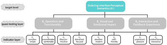 By sorting out and summarizing the user requirements of the ordering interface design, the requirement hierarchy is divided into three layers: the goal layer, the criterion layer, and the indicator layer. The first layer (goal layer) is defined as the perceived semantics of the ordering interface A. This represents the ultimate goal of this study, i.e., the interface design’s comprehensive satisfaction of users’ emotional and functional needs. The second layer (criterion layer) consists of three aspects: “Operation and Functionality B1”, i.e., focusing on the simplicity of the interface’s operation and the completeness of its functionality; “Visual and Emotional Impact B2” evaluates the visual appeal of the interface and its emotional impact on the user. “Interaction and Feedback Experience B3” assesses the smoothness of user interaction with the interface and the timeliness of feedback. The third layer (indicator layer) is defined as the eight affective imagery words extracted from the above principal-component-based analysis, which are used as specific indicators for assessing the criterion layer. The final hierarchical model of the ordering interface is shown in Figure 6.