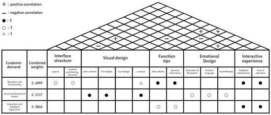 - To accurately map user requirements to design elements to ensure the comprehensiveness of the design solution, morphological analysis was used to deconstruct the design of the ordering interface. It was divided into five elemental variables through group discussion. On this basis, a QFD mapping model was established to transform user requirements into specific design elements. The core requirement weights derived from AHP were used as the left wall requirements of the quality house, and the interface design elements were mapped to the roof area as design elements. The focus group assessed the correlation between requirements and design elements through the Delphi symbol system: Δ means 1 point (weak correlation), ○ means 3 points (medium correlation), ● means 5 points (strong correlation), and blank means no correlation. A multidimensional correlation matrix between requirements and design elements was established based on the symbolic score data. We calculated the importance of design elements according to the weighted sum formula, derived the absolute and relative weights of elements, visualized the weights of user requirements and design elements, and helped to optimize design decisions.