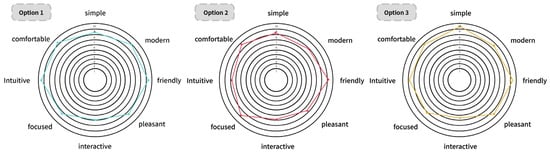 In this study, we use PCA to deal with the correlation between perceptual imagery words and the problem of excessive data dimensionality. In order to explore the sorting interface, the correlations between the data were analyzed using SPSSAU software. The results showed that the Cronbach’s alpha coefficient reached 0.927, indicating that the questionnaire had high internal consistency and good data reliability. Meanwhile, the KMO value was 0.742, indicating that the variables had correlations suitable for factor analysis. In addition, the results of Bartlett’s test of sphericity showed that the approximate chi-square value was 171.912, the degree of freedom was 36, and the significance p-value was less than 0.05, which further confirmed that the correlation between the variables was statistically significant and suitable for PCA analysis [60]. According to the judgment criteria of the scree plot, the first three principal components with eigenroot values greater than 1 were selected. The first principal components “complex–simple”, “uncomfortable–comfortable”, “fuzzy–intuitive”, and “distraction” can be categorized as operation and function; the second principal components “outdated–modern” and “indifferent–friendly” can be categorized as related to visual and emotional impact; and the third principal components “unpleasant–enjoyable”, and “unidirectional–interactive” can be categorized as related to interaction and feedback experience, as shown in Table 4. This not only simplified the structure of variables but also makes our interpretation of the data more intuitive and clear.