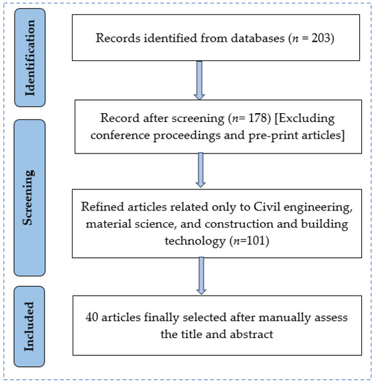 The “Web of Science” database was used to conduct the literature search due to its extensive coverage of peer-reviewed journals, reliable citation tracking, advanced search features, and the ability to access interdisciplinary research, which collectively facilitate a thorough and efficient review of existing literature [18]. The searching criteria were “topic”, which includes “title”, “abstract”, and “keywords”. The keywords used to formulate the filtering query were “fiber-reinforced polymer”, “fiber-reinforced plastic”, “FRP”, “FRC”, “FRCC”, “ECC”, and “SHCC”. The search link can be found here [19]. Two hundred and three articles were found in the first search, then the number of articles was refined to only peer-reviewed articles by excluding conference proceedings and pre-print articles, which reduced the number of articles to 178. Further refining was carried out to select only those related to civil engineering, material science, construction, and building technology, which reduced the number of articles to 101. Finally, the title and abstract of the articles were manually selected to assess the relevant articles that focus only on structural performance, and 40 articles were selected. Figure 2 shows the flow of the article selection methodology using the PRISMA flow chart model.