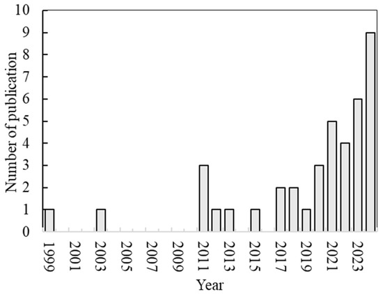 The study reviewed 40 articles published between 1999 and 2024. Recently, researchers have shown a growing interest in using fiber-reinforced polymer bars to strengthen fiber-reinforced cementitious composites. It is shown in Figure 3 that from 1999 to 2020, studies did not exceed an average of two articles per year. In 2021 and 2022, the number of articles increased to four and five per year. However, the most significant increase was in the past two years, 2023 and 2024, when there were six and nine articles published per year.