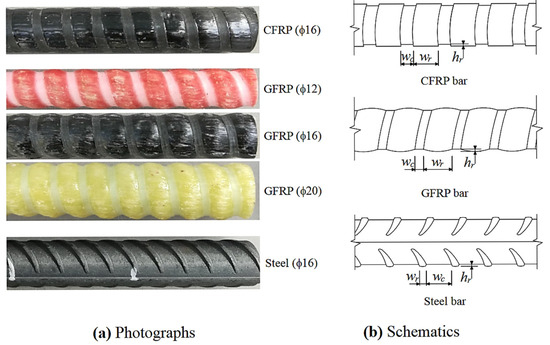 Figure 7 shows some examples of types of rebars and surface configurations. Zhao et al. [20] developed a simplified bond-strength model based on an experimental result of a direct pullout test that considered the FRP bars’ surface geometry, such as the rib spacing and rib height. The model is validated using a proposed equation for bond strength. The maximum bond strength value from the proposed equations demonstrated a strong correlation with the experimental results. It is important to note that this model specifically pertains to ribbed reinforcing bars, where bond failure is predominantly governed by shear failure of the matrix. For reinforcing bars with different surface treatments, a more comprehensive investigation is required to accurately assess the calculation of maximum bond strength.