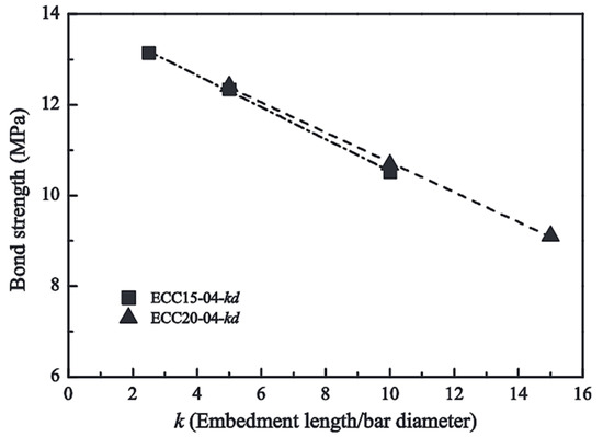 The bond strength reduced with an increase in embedded length. This reduction can be attributed to the calculation of bond strength based on the assumption of a uniform bond stress distribution. However, a more pronounced non-uniform distribution of bond stresses typically occurs with greater embedded lengths and the Poisson effect [23,25,30]. Wang et al. [25] reported that a greater load is needed to pull out the BFRP bar with increased embedment length. However, due to the Poisson effect, this extended embedment length results in a significant decrease in confinement and mechanical interlocking, subsequently reducing bond strength. Additionally, it has been reported that a linear relationship can effectively characterize the correlation between average bond strength and embedment length. Figure 8 illustrates the experimental findings regarding the influence of embedment length on the average bond strength of the BFRP bar.