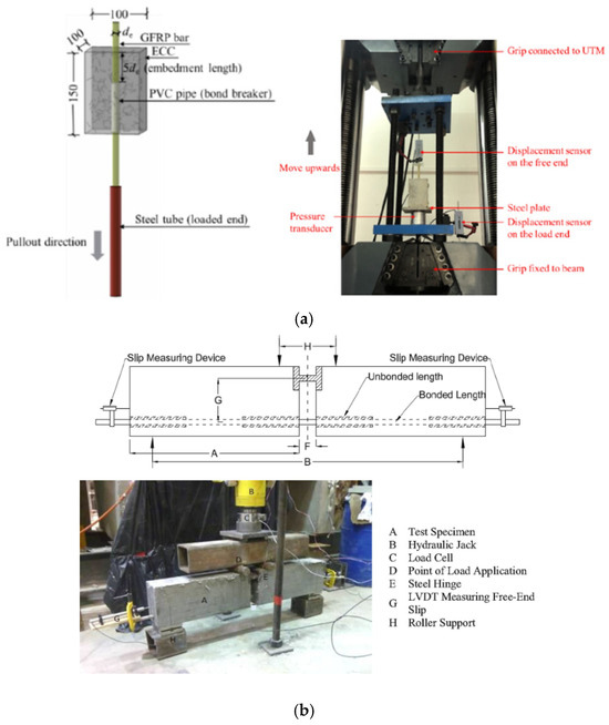 Kim et al. [28] conducted an experimental investigation to study the bond–slip behavior of two types of GFRP bars, helically wrapped (HW-GFRP) and sand-coated (SC-GFRP), and a steel bar in PVA-ECC. From the experimental results, it is reported that the interfacial bond strength of HW-GFRP was much higher than that of SC-GFRP and similar to the steel bar. The overall energy absorption capacity of HW-GFRP bars exceeded that of conventional steel bars. In contrast, the SC-GFRP bars showed frictional pullout failure at the interface between the resin and the fiber reinforcement, along with reduced matrix splitting, irrespective of the properties of the matrix material.