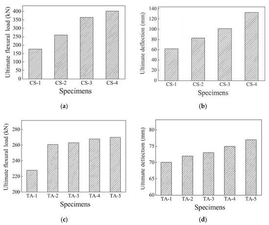Cai et al. [35] analyzed the flexural behavior of ECC beams reinforced with BFRP bars using a nonlinear finite element model. The simulation outcomes were validated against experimental data published by Yuan et al. [34]. Through finite element analysis, the influence of various parameters on the mechanical behavior of BFRP-reinforced ECC beams was investigated. These parameters included compressive strength (CS) values of 30, 45, 60, and 75 MPa, ultimate tensile strain (TA) levels of 0.5, 1.5, 2.5, 3.5, and 4.5%, tensile strength of ECC (TE) at 2, 4, 6, and 8 Mpa, and longitudinal reinforcement ratios (LR) of 0.2, 0.4, 0.6, 0.8, and 1%. The findings, illustrated in Figure 11, indicate that the ultimate strength of the beams increased with all parameters, except for the tensile strain of ECC when it exceeded 1.5%. Additionally, the ultimate deflection was observed to rise with increasing compressive strength and tensile strain of ECC, while the ultimate tensile stress exhibited minimal influence on the ultimate deflection of BFRP-reinforced ECC beams. Furthermore, variations in the longitudinal reinforcement ratio were found to alter the failure mode of the ECC beams. Notably, for over-reinforced beams, an increase in the longitudinal reinforcement ratio resulted in a decrease in ultimate deflection. The simulation results showed good agreement with the experimental results.