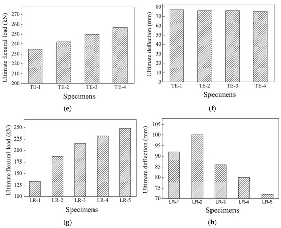 Analyzed flexural behavior of ECC beams reinforced with BFRP bars: (a,b) effect of compressive strength of ECC on the ultimate flexural load and ultimate deflection; (c,d) effect of tensile strain of ECC on the ultimate flexural load and ultimate deflection; (e,f) effect of tensile strength of ECC on the ultimate flexural load and ultimate deflection; (g,h) effect of longitudinal reinforcement ratio on the ultimate flexural load and ultimate deflection [35].