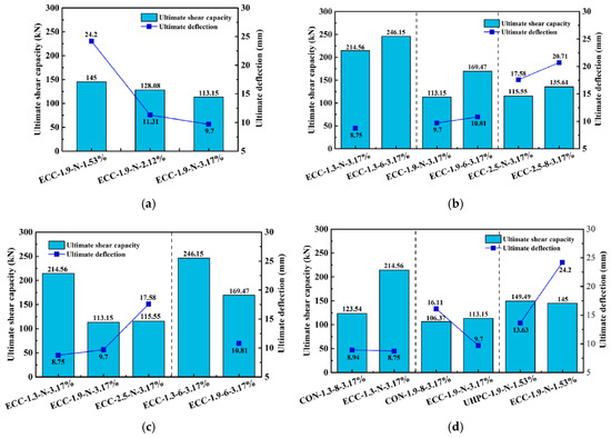 Ultimate shear capacity of tested beams: (a) effect of longitudinal reinforcement ratio; (b) effect of stirrup ratio; (c) effect of shear span ratio; (d) effect of concrete type [59].