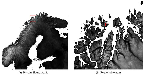 The Scandinavian Peninsula, comprising Norway and Sweden, is shown in Figure 1a together with parts of Finland and Russia. The white colour shows sea level and the brightness from black to white shows terrain heights from sea level up to 2500 m. The peninsula is bordered by the Barents Sea, the Norwegian Sea, the North Sea and Baltic Sea to the north, west, south and east, respectively. Norway has a long coastline with several fjords and valleys that extend into the Scandinavian Mountains, a rugged landscape that is significantly different from Sweden where the terrain in general drops smoothly from this mountain range into the Baltic Sea.