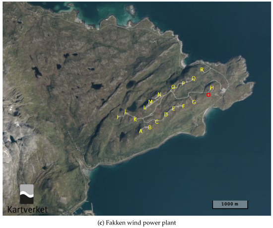 Gray scale showing terrain height from Global Multi-resolution Terrain Elevation Data (GMTED) at 30-arcsecond resolution by United States Geological Survey. (a) Scandinavia peninsula. (b) Regional terrain. (c) Aerial photo using www.norgeskart.no (accessed on 1 March 2025). Red O: Location of measurement mast. Yellow letters: Location of wind turbines.