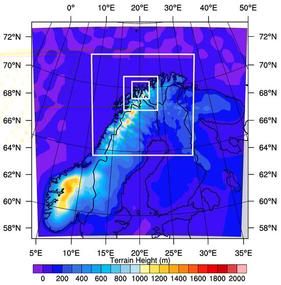 A higher spatial resolution in a numerical weather model can follow the terrain variations and capture large eddies in the atmospheric flow. In WRF, large eddy simulations (LESs) are applied by turning off the planetary boundary layer scheme, and the terrain height of the inner D05 domain enclosing the Fakken wind power plant is shown as a black rectangular box in Figure 3. The LES model domain is set up with a 3d Smagorinsky diagnostic K for sub-grid turbulence (km_opt = 3), the recommended diffusion option for complex terrain (diff_opt = 2), and sound-wave damping to allow for steep hills (epssm = 0.8).