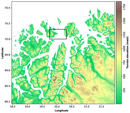 The regional terrain in Figure 1b shows the coastal terrain in northern Norway corresponding to the red rectangle in Figure 1a, and Fakken wind power plant is located at approximately 70° north latitude and 20° east longitude marked with a red rectangle in this regional terrain plot. There are several fjords and mountains that influence the wind at this point. Vannkista is 5 km west and has an elevation of 947 masl and Trolldalstinden is 12 km east (898 masl), both surrounded by similar mountains creating natural barriers to surface-level zonal wind. Starting about 20 km south-southeast, the Lyngen Alps are a dominant mountain range that has several mountains with elevations of 1500–1800 m, which drop abruptly into the 82 km long Lyngen Fjord to the east and 75 km long Ullsfjord to the west. These fjords are prone to meridional surface wind, and the mountain range can create lee spots in the fjords in cases of zonal wind in the atmosphere.