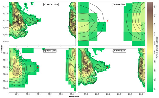 Terrain height zoomed in on the D05 location. Contour lines every 100 m, starting at 50 m. Red dot: Location of measurement mast. (a) Norwegian Digital Terrain Model, 10 m horizontal resolution. (b) WRF D03, 3 km resolution. (c) WRF D04, 1 km resolution. (d) WRF D05/LES, 90.9 m resolution.