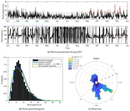 The histogram of the measured wind speed during 2017 is shown in Figure 5b, together with Rayleigh and Weibull distributions where the parameters are found using maximum likelihood estimates of the parameters. The histogram shows the highest frequency of wind speeds in the 6–7 m/s bin, where both the Rayleigh and Weibull distributions tend to underestimate the probability of these wind speeds. The histogram also has a slightly higher frequency of wind speeds when m/s, compared to the smoother estimated probability density functions.
