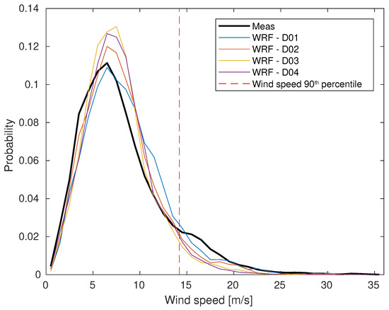 Table 1 shows the mean, STD, RMSE and R for the measured and modelled wind speed for 2017. The average wind speed from measurements was m/s, which is quite well represented by the WRF model, although D01 has a slightly higher value and D02–D04 slightly lower. The measured wind speed standard deviation is , while the modelled wind speeds are in the –-range.