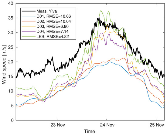 The legend in Figure 8 shows the RMSE values for the different model resolutions when only considering the Ylva storm event. The LES model can represent strong wind speeds during the event quite well and thus shows clearly lower RMSE results compared to the lower-resolution models. Increasing the resolution in the WRF models has a visible effect on the variability of the wind speeds, as the D01 result is quite smooth with slower variations than the high-resolution models. The high frequency variations in the LES model might explain the lower linear correlation to the measurements, since the timing for these variations does not necessarily match the measurements, although the standard deviations for these time series are similar.