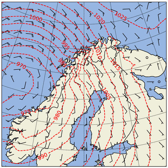 Figure 9 shows the WRF model D01 sea level pressure on 23 November at 20:20, where the maximum wind speed of 35.1 m/s was measured, together with modelled wind speed barbs close to the surface indicating wind speed and direction. The synoptic situation during the Ylva storm event can be described by a strong low-pressure system (970 mbar) located in the Norwegian sea and a high-pressure system (1025 mbar) over the Kola peninsula to the east of North Norway [41]. The counterclockwise wind around the low-pressure system created strong wind from the southeast as the system moved north along the Norwegian coast.