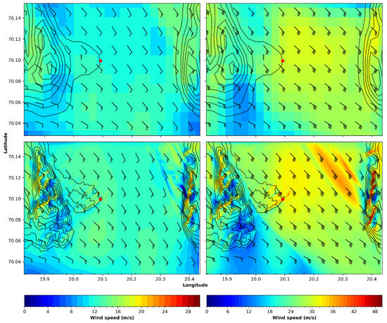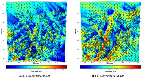 Figure 10 shows the wind speed of 80 magl in D04 in two instances during the Ylva event, on 23 November at 00:00 and 20.20, respectively. The first instance is at the start of the event (Figure 10a), when the wind speed builds up at Fakken as the low-pressure systems come closer. The two large fjords south of Fakken are separated by the Lyngen Alps that direct the wind north on its eastern side, which then turns more easterly and against Fakken as it passes this mountain range. The next instance is in the middle of the storm (Figure 10b), when the measurements show the highest wind speeds. The overall wind direction has now turned slightly anticlockwise, but the fjords and mountains around Fakken make the wind direction at the measurement mast location very similar. The Lyngen Alps still lead some wind east of the mountain range in a northerly direction along the fjord, and a high-wind-speed location can be seen at the ocean in front of the Fakken wind park location. The complex terrain creates localised shadowing and tunnelling effects, and lee-side amplification indicates mountain waves in several places in the region, as also discussed in [27].