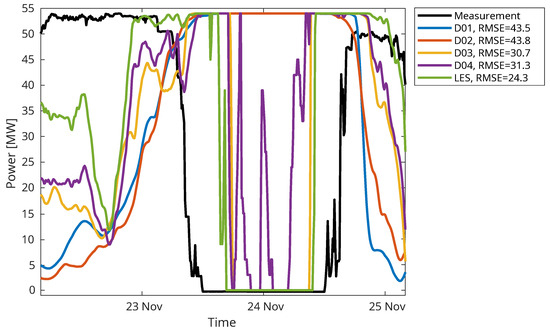 Using the publicly available power curve of the Vestas V90 3 MW turbine, we have extracted the wind speeds from the WRF models at the location of each wind turbine, as shown in Figure 1c, and calculated the corresponding wind power production at Fakken wind park. The power production results of the different models are shown in Figure 12 together with their RMSE. As expected, the D01 and D02 models show very low power production during the start and end of the event, but also full production during the strongest part of the Ylva storm. This is a direct result of the underestimation of wind speed, as discussed earlier. The power productions using the D03 and D04 models are higher during the start and end of the storm event, and, in addition, they are also able to output zero production at times during the main storm event. Finally, the power production using WRF LES result shows clearly higher production during the start and the end of the event, and this method provides a longer period of zero production during the storm, although not as long as the measured production. The RMSE values summarise the overall model production, with LESs giving the lowest error, which was also seen for the RMSE of wind speeds in Figure 8.