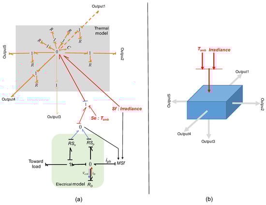Schematic representation of an elementary photovoltaic cell model. (a) The bond graph illustrates thermal and electro-thermal interactions within the cell. (b) The equivalent block diagram summarizes the key system components for simulation and analysis.